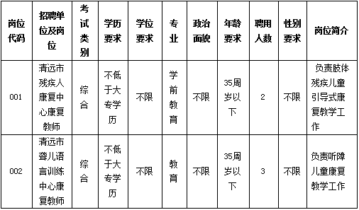 清遠(yuǎn)市殘疾人康復(fù)中心、清遠(yuǎn)市聾兒語(yǔ)言訓(xùn)練中心,是市殘聯(lián)直屬公益一類事業(yè)單位,是專門為0-6歲殘障兒童康復(fù)的機(jī)構(gòu)。根據(jù)工作需要招聘康復(fù)教師5名(屬非編制人員,不列入用人單位編制序列,不擔(dān)任行政職務(wù)),現(xiàn)將有關(guān)事項(xiàng)公告如下: