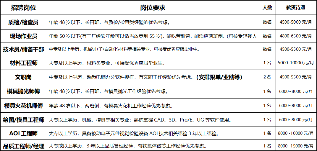 福利待遇:五險一金\各類補貼\培訓\包食宿\體檢等。
