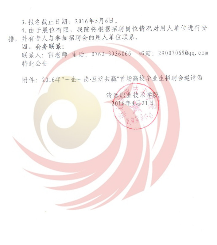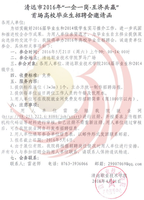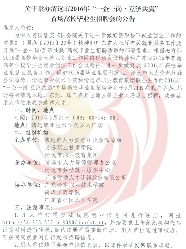 為深入貫徹落實《國務(wù)院關(guān)于進一步做好新形勢下就業(yè)創(chuàng)業(yè)工作的意見》(國辦﹝2015﹞23號)精神和廣東省人社廳有關(guān)就業(yè)服務(wù)工作及開展“一企一崗▪互濟共贏”高校畢業(yè)生找屁活動的部署要求,根據(jù)教育部2016屆高校畢業(yè)生就業(yè)創(chuàng)業(yè)工作網(wǎng)絡(luò)視頻會議精神和廣東省2016年普通高等學校畢業(yè)生就業(yè)創(chuàng)業(yè)工作會議精神,進一步做好我市2016年高校畢業(yè)生就業(yè)服務(wù)工作,促進2016屆畢業(yè)生順利就業(yè)。清遠市人力資源四川和社會保障局,清遠市職業(yè)技術(shù)學院和清遠市職業(yè)教育集團聯(lián)合主辦的2016年“一企一崗▪互濟共贏”首場高校畢業(yè)生招聘會定于5月21日在清遠市職業(yè)技術(shù)學院舉辦,屆時將有清遠本地、東莞、珠三角其他地區(qū)等企業(yè)入場設(shè)點招聘,歡迎各用人單位到清遠市職業(yè)技術(shù)學院選聘人才。